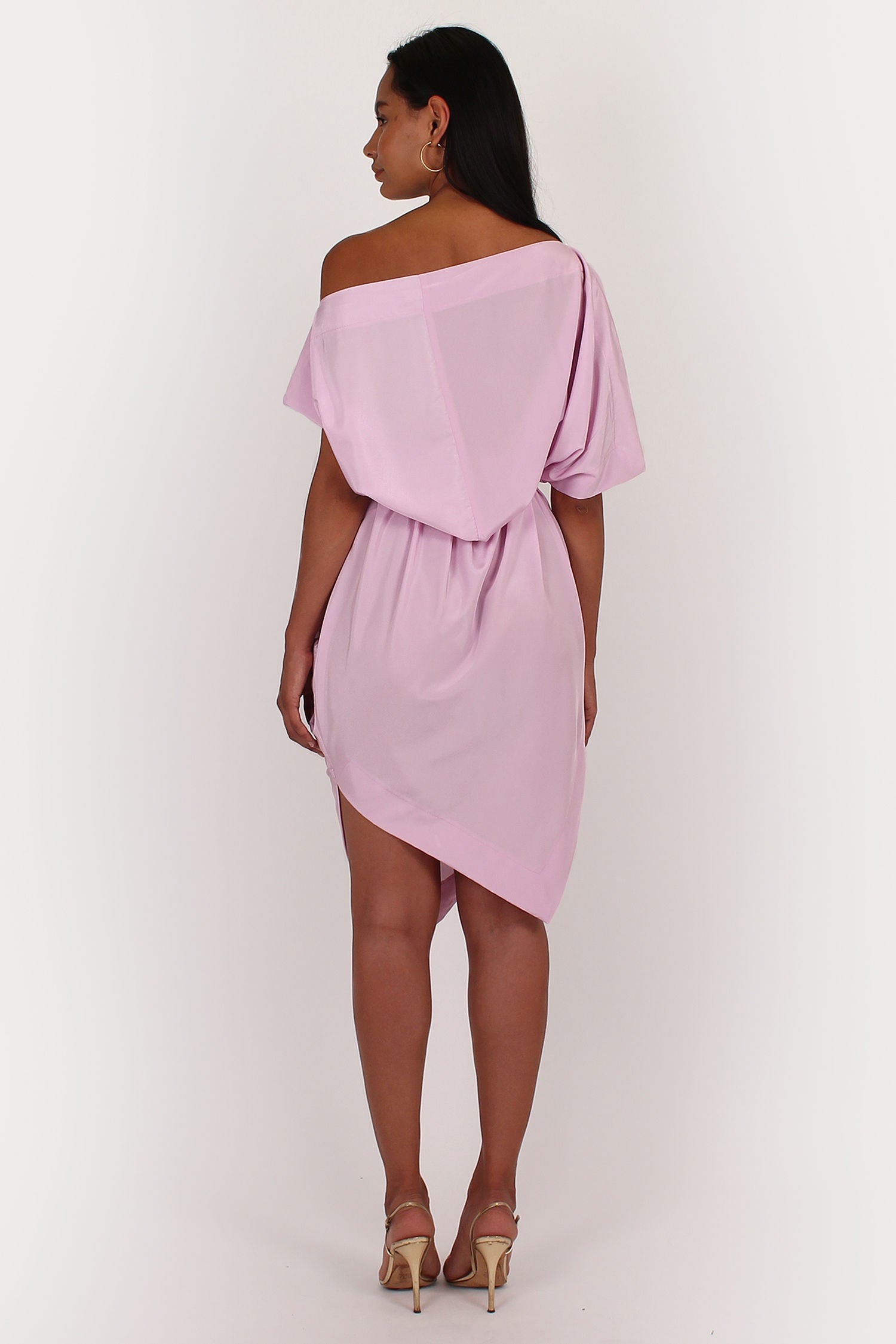 Pale pink off the shoulder abstract cut dress with asymmetric hemline.