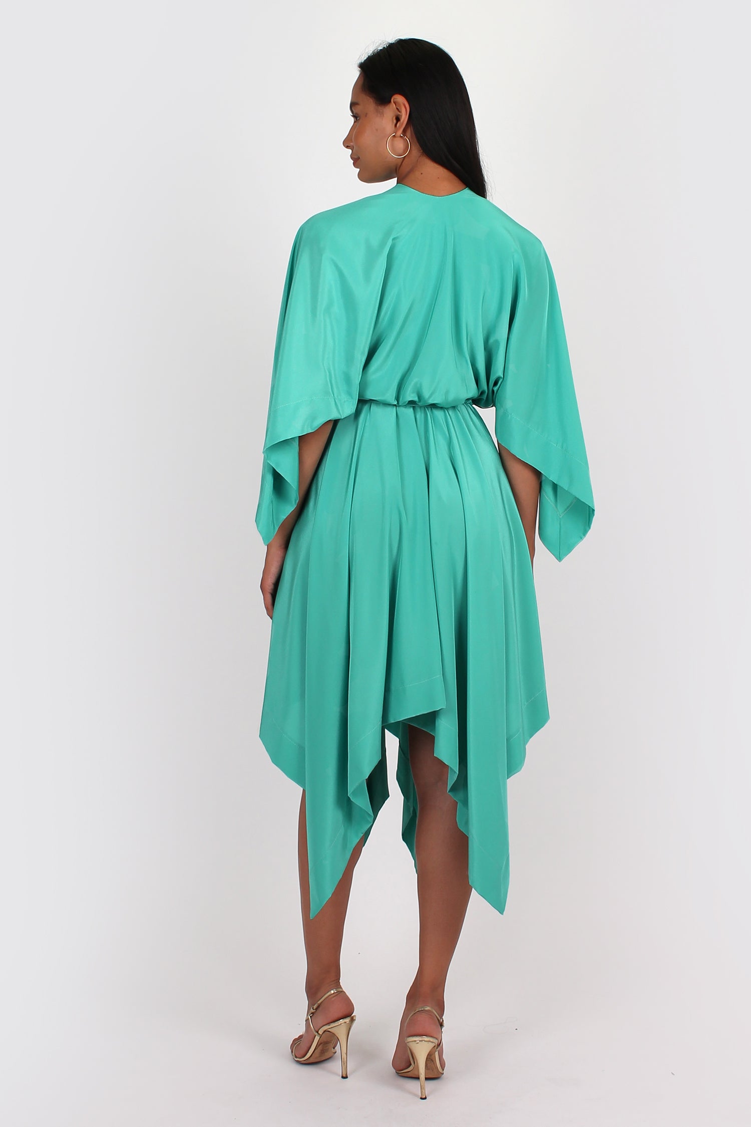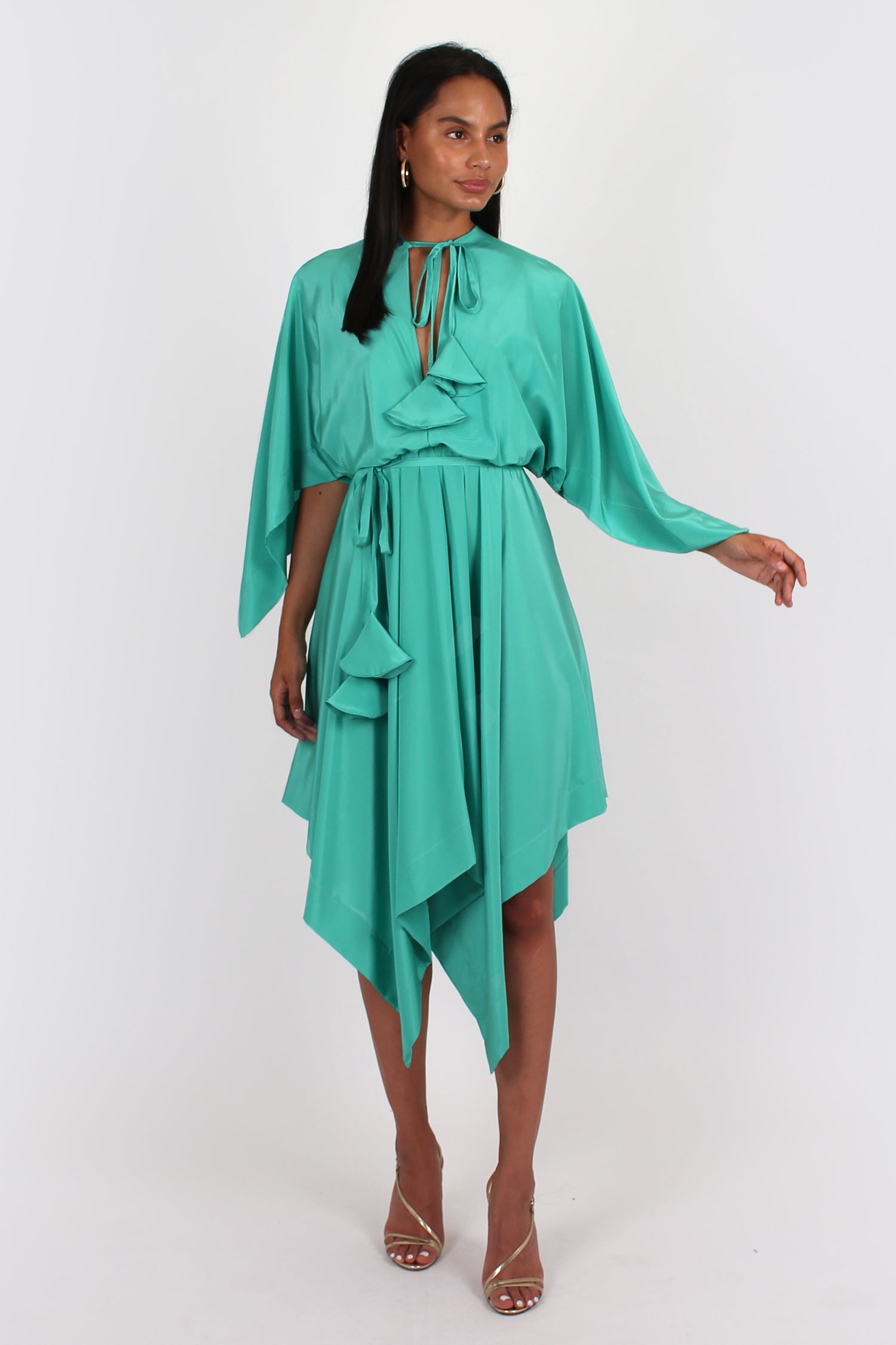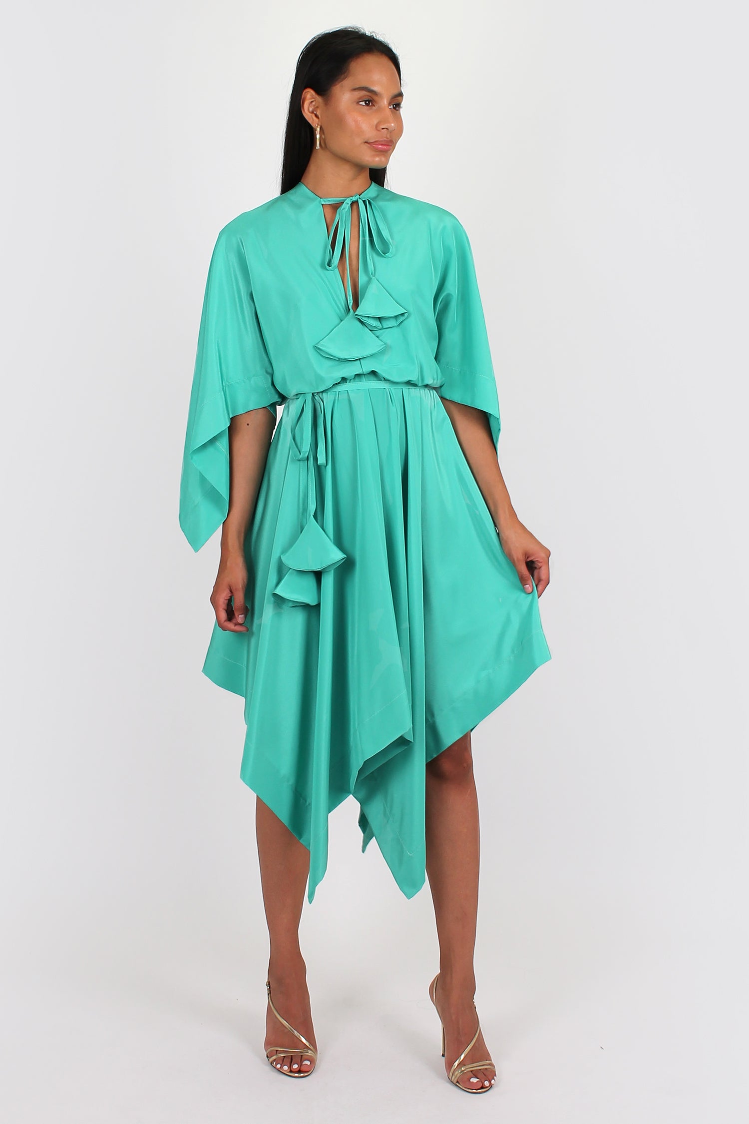 The Orphelia Dress is a great dress for a special occasion. It has 3/4 sleeve, tie at the neck and elastic through the waist. It comes with a matching belt that isn't attached so is optional wether you wear it with or without.The skirt has an asymmetric hemline.