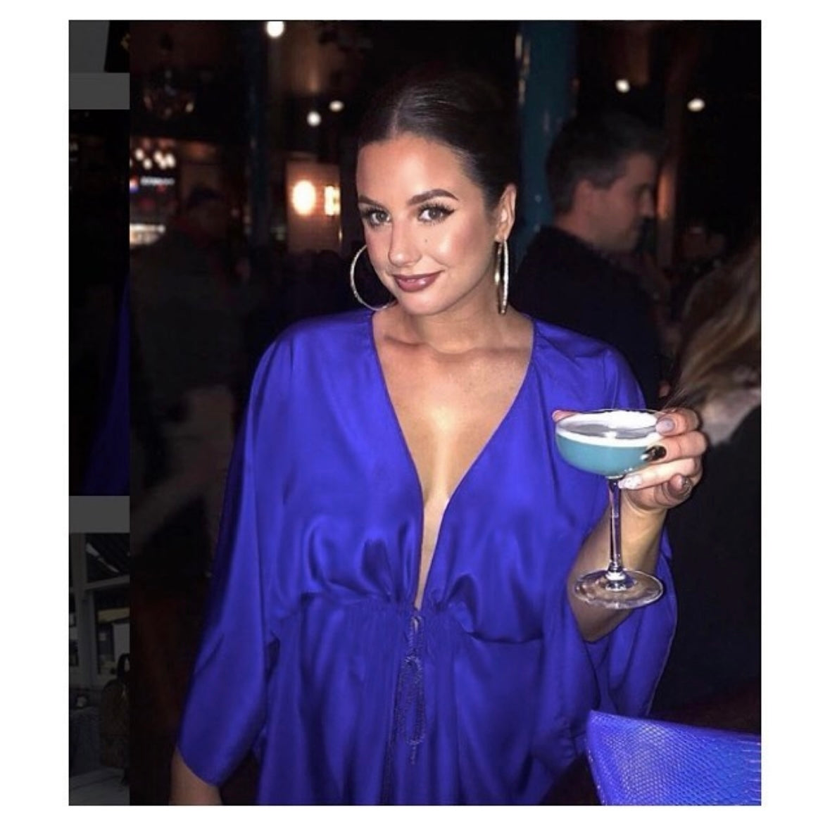 Deep V top with drawstring through the waistline. Made from a a royal blue crepe de chine fabric