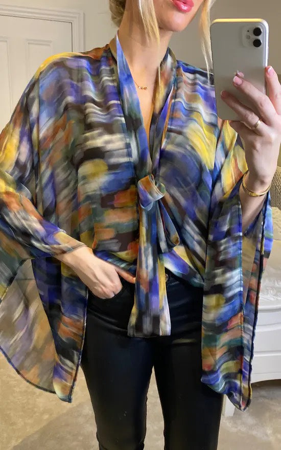 The Romeo Blouse is made from a floaty soft chiffon fabric with a bold print. It has long sleeves and a pussy bow tie at the neck that can be either worn tied as a bow around neckline or hanging lower into a V neck. It has elastic in the wasitline.