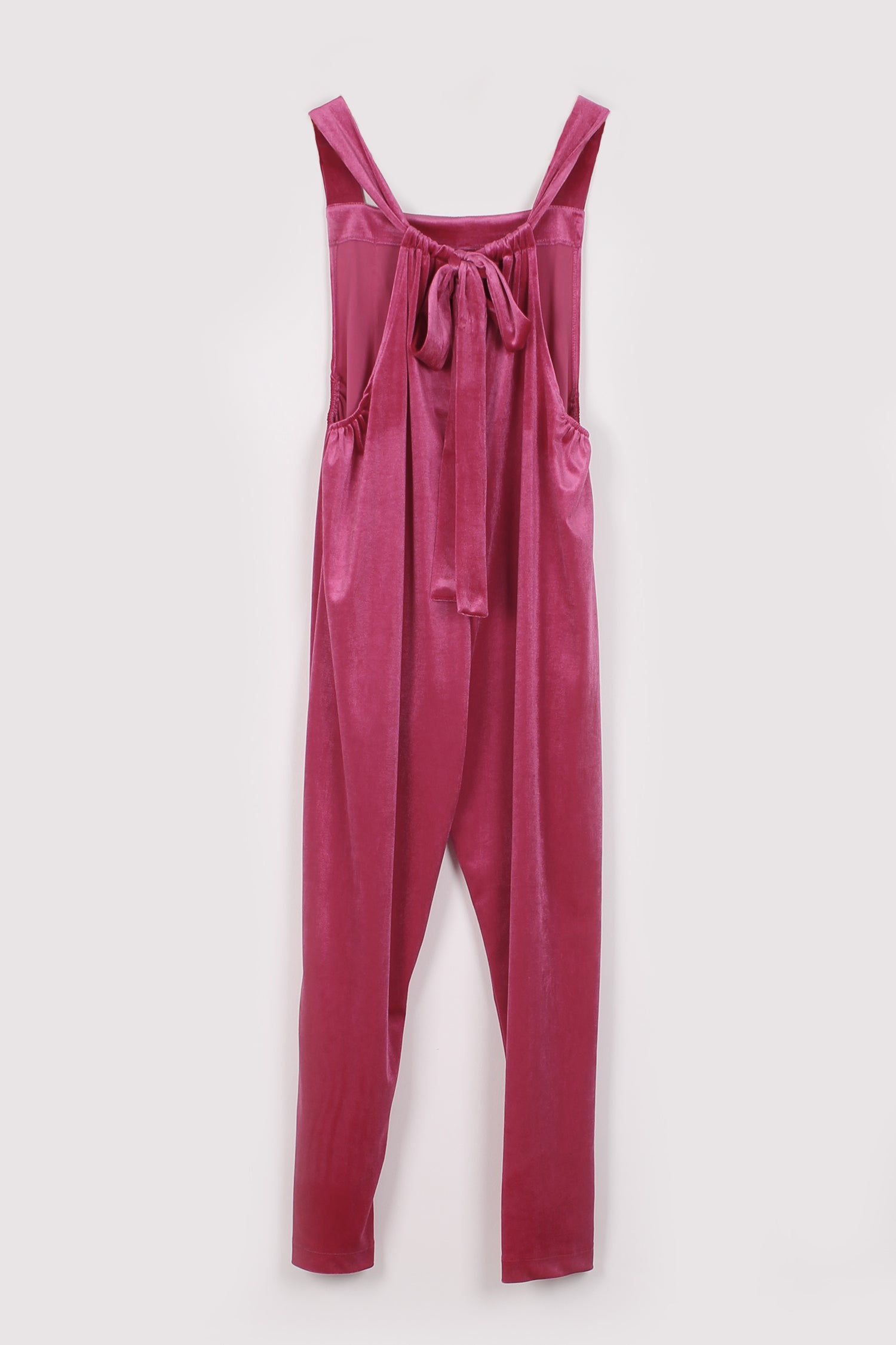 Our velvet dungarees are a one size item that you step into. They don't have any zips or fastenings but strap length can be adjusted and tied as tight as needed at the back. They are an ankle gazer length so perfect with shoes or also great with a boot or a high top trainers. A great item that can be dressed up for the pub with a pretty blouse or worn casual with trainers and a t shirt.
